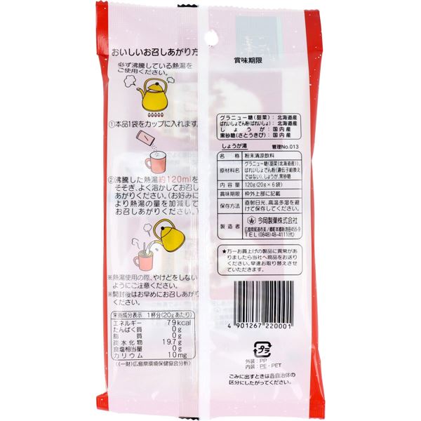 【しょうが湯の原材料】砂糖、ばれいしょでん粉(遺伝子組換えではない)、しょうが、黒砂糖【栄養成分表示/1袋分(20g)あたり】エネルギー・・・79kcaLたんぱく質・・・0g脂質・・・0g炭水化物・・・19.8gナトリウム・・・0mgカリウム・・・10.2mg((財)広島県環境保健協会分析)【保存方法】・直射日光、高温多湿を避けて保存してください。